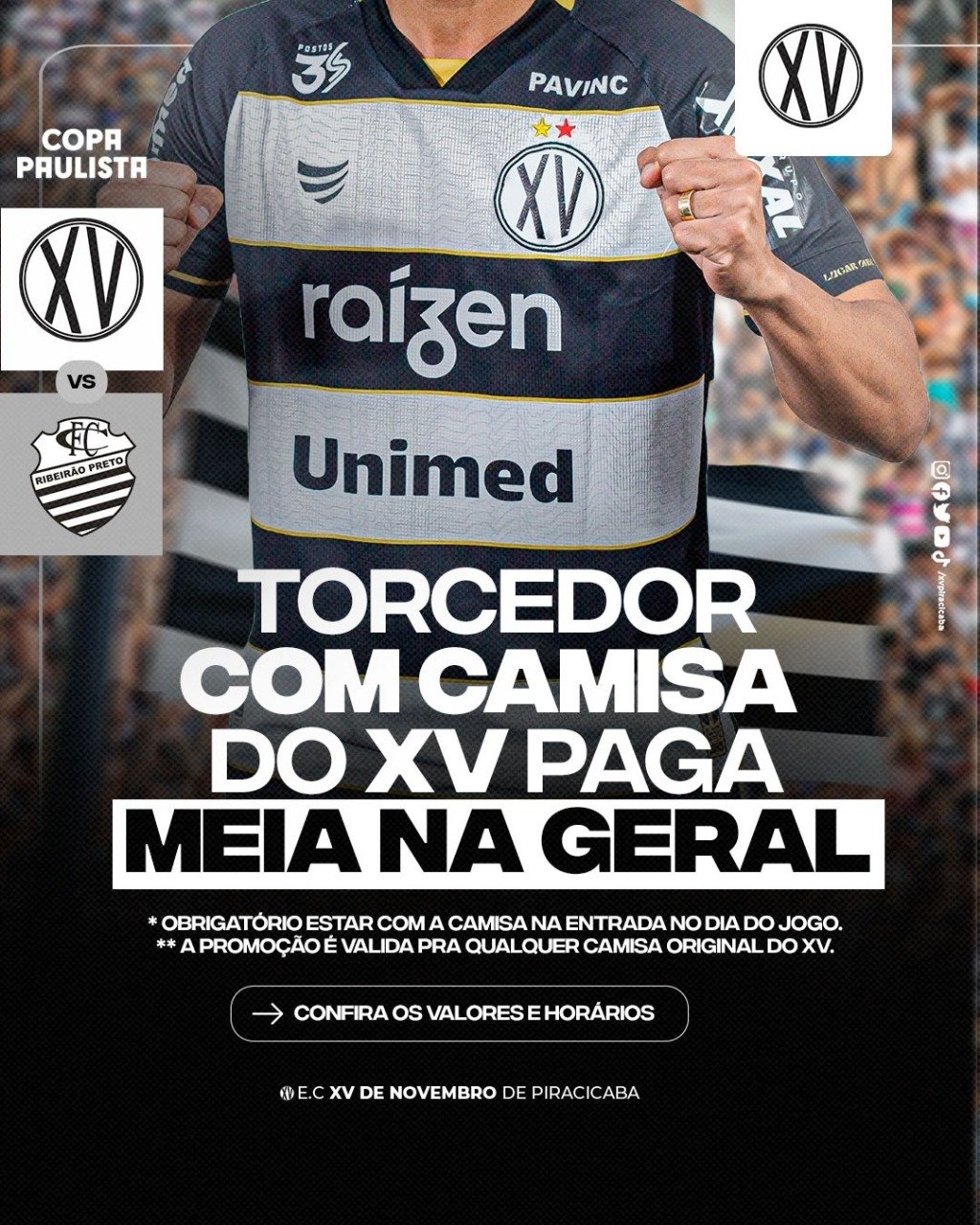 *Para esse jogo, torcedor com camisa do XV original paga meia nos setores 5 e 6 (geral).