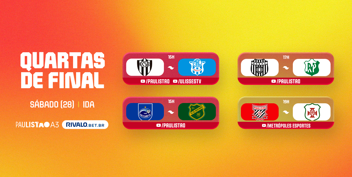 Todos os jogos de ida das quartas de final do Paulistão A3 Rivalo acontecem neste sábado, 28 de março. Às 15h, São Bernardo e Rio Claro recebem, respectivamente, Marília e XV de Jaú; às 17h, União Barbarense e Rio Preto se enfrentam em Santa Bárbara D’Oeste; enquanto às 19h, em Jundiaí, Paulista e Portuguesa Santista se enfrentam.