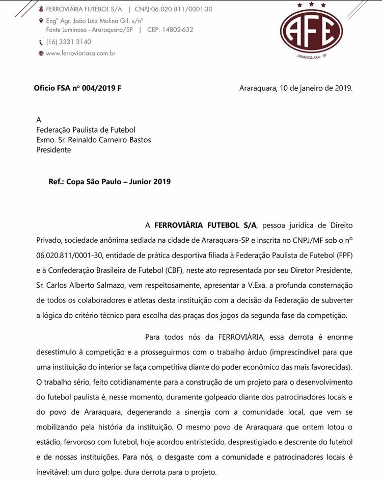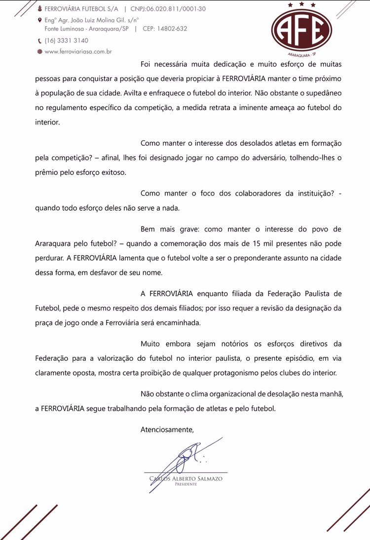 A Ferroviária, apresenta profunda consternação de todos os colaboradores, atletas e torcedores desta instituição com a decisão da Federação Paulista de Futebol de subverter a lógica do critério técnico para escolha das praças dos jogos da segunda fase da competição. O futebol sai derrotado.