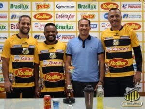 Danielzinho (meia), Luis Carlos Goiano (Dir. Exe. de Futebol do Novorizontino) e Dudu Vieira (volante) – Foto: Thomaz Jannuzzi / Grêmio Novorizontino