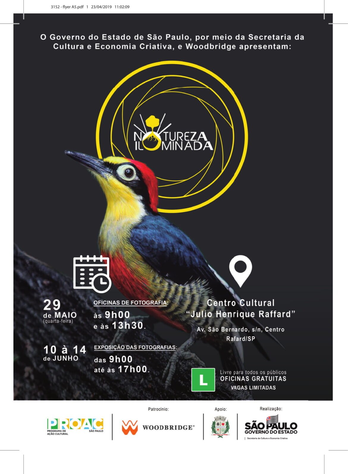 As oficinas gratuitas do projeto Natureza Iluminada acontecem na quarta-feira (29), às 9h e às 13h30, no Centro Cultural. Após as oficinas, Rafard receberá a exposição fotográfica, do dia 10/06 até 14/06, também no Centro Cultural. A entrada é gratuita.