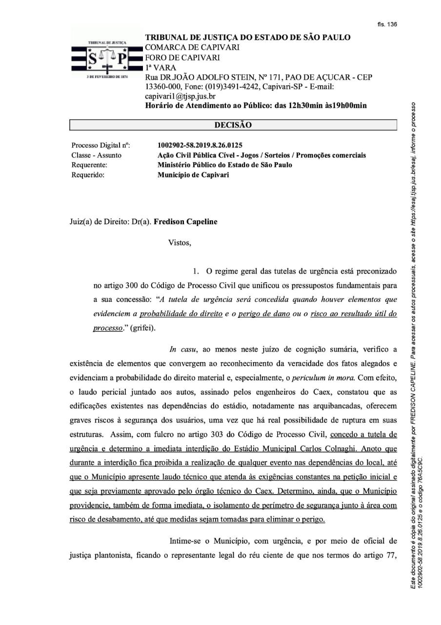 A Prefeitura de Capivari informa que, diante da Ação Civil Pública movida pelo Ministério Público do Estado de São Paulo, acata a decisão de interdição do Estádio Municipal Carlos Colnaghi, a Arena Capivari, porém não concorda com a mesmauma vez que o Estádio tem todas as aprovações necessárias para a realização de jogos, como o AVCB do Corpo de Bombeiros, Laudo de Condições Sanitária e de Higiene, Laudo de Prevenção e Combate de Incêndio, Laudo de Segurança e Laudo de Vistoria de Engenharia.