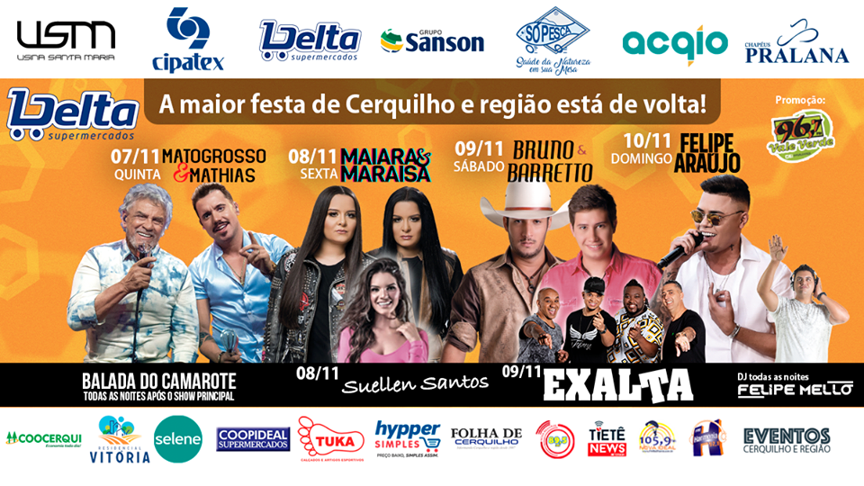 A tradição da Festa do Peão de Boiadeiro de volta a Cerquilho. Mais uma vez a MCA e Pepê Eventos trazem a cidade a magia da galera de bota e chapéu, com a mesma estrutura das grandes festas de peão do interior, Cerquilho oferece em 2019 tudo aquilo que se pode esperar de um grande evento, ampla praça de alimentação, montarias shows inesquecíveis como Felipe Araujo, Maiara e Maraisa, segurança, e tudo isso com um diferencial, patrocinador master Brahma.