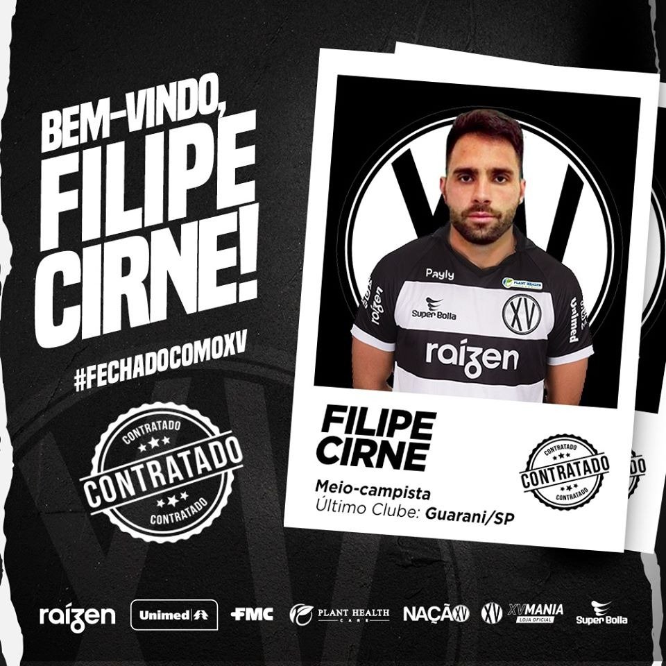 O XV de Piracicaba confirmou na tarde desta quinta-feira (19), mais um reforço para a temporada 2020. O meia Filipe Cirne, de 27 anos, que defendeu o Guarani no Campeonato Brasileiro da Série B, na atual temporada, acertou sua transferência ao time piracicabano por empréstimo. O atleta, que deve se apresentar no dia 27 de dezembro, pertence a equipe brasiliense Real FC. O vínculo com o Nhô Quim é válido até o final do Campeonato Paulista da Série A2.