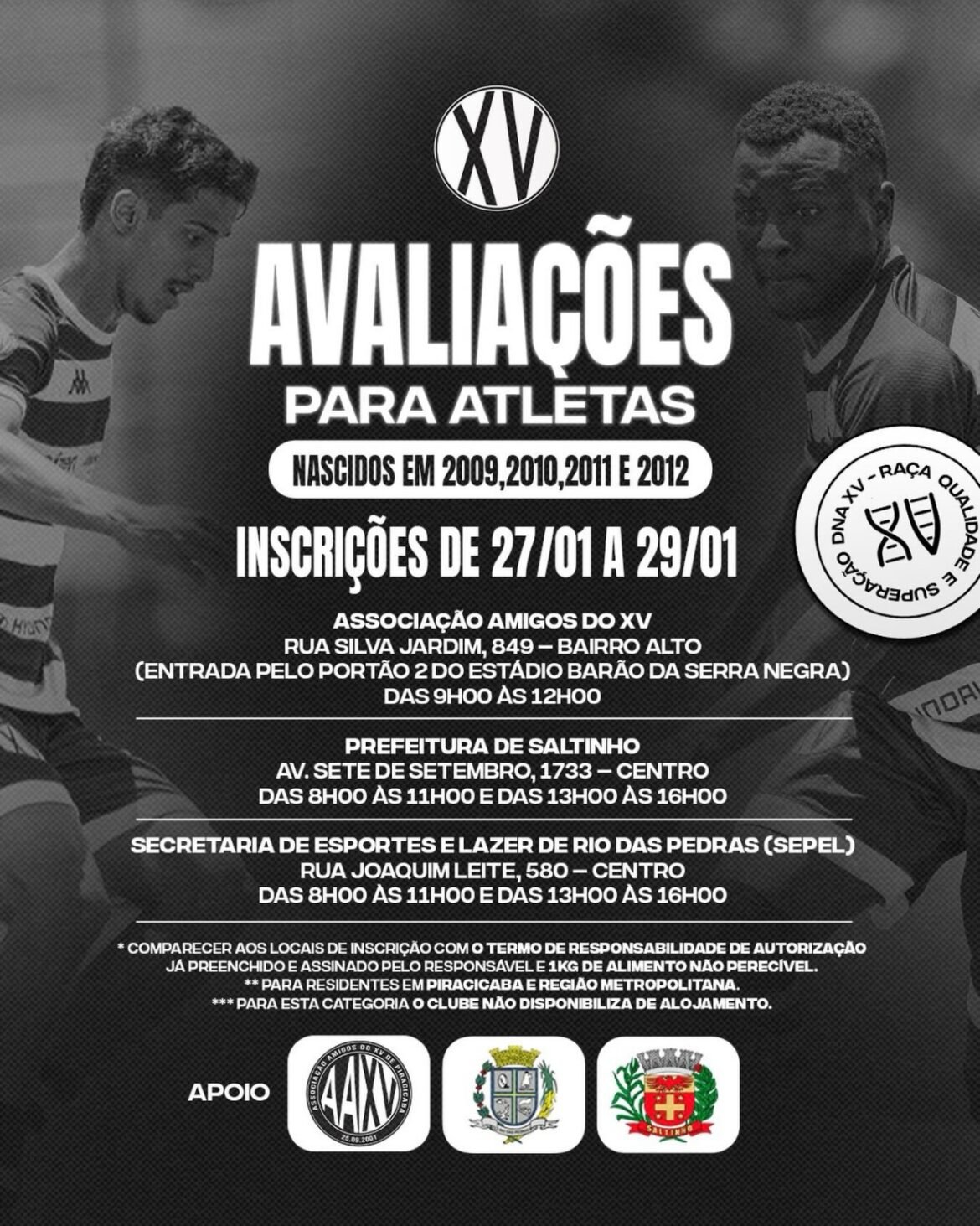 O XV de Piracicaba realizará avaliações para as suas categorias de formação, com nascidos nos anos de 2009, 2010, 2011 e 2012, residentes na cidade de Piracicaba e região metropolitana, já que o clube não possui alojamento para atletas dessa faixa etária. As inscrições deverão ser feitas nos dias 27, 28 e 29 de janeiro. A novidade desta vez é que serão três postos de inscrições, conforme segue: